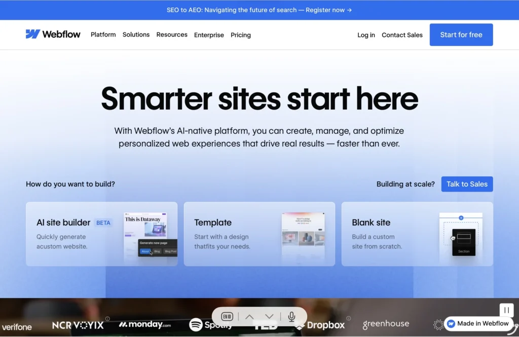 It offers more design flexibility than Wix or Squarespace while still handling hosting and performance behind the scenes. Websites built with Webflow are typically fast and visually polished.